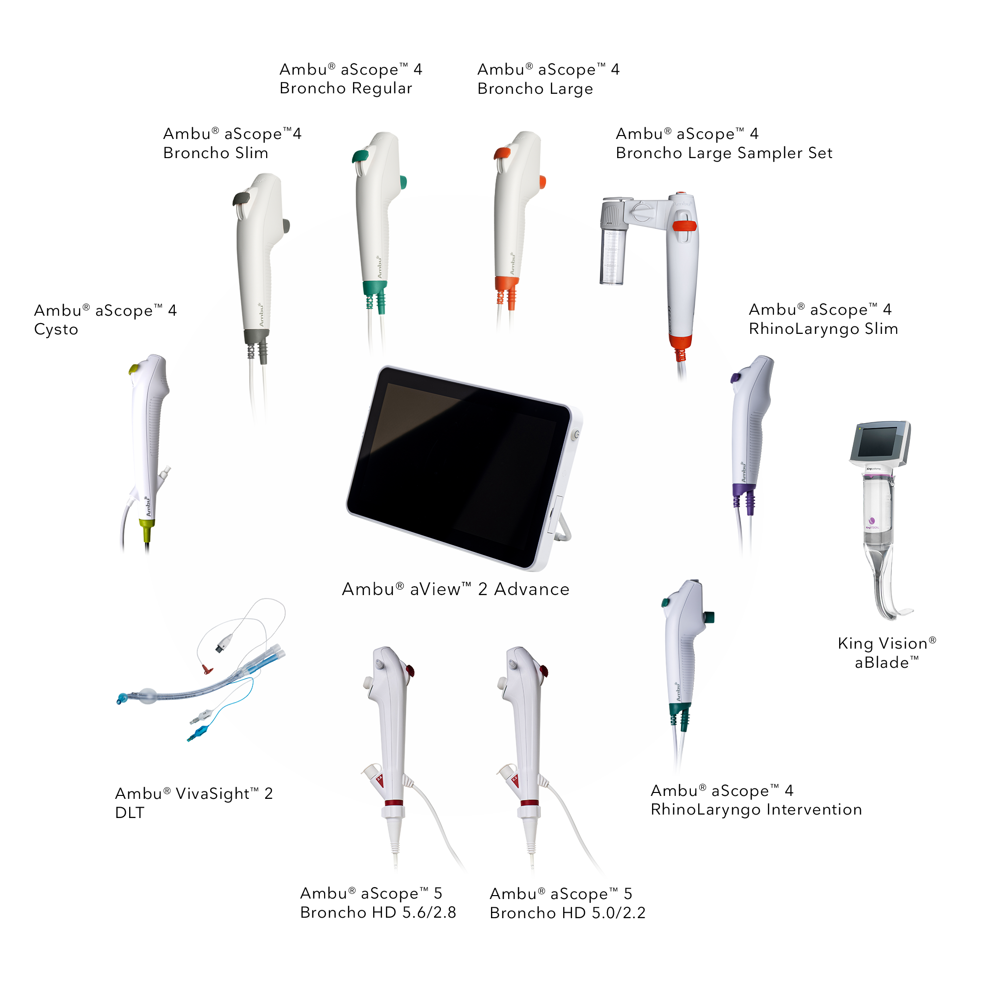 aScope 4 Broncho is guaranteed sterile, always available and part of an integrated solution that improves safety, workflow and productivity. The bronchoscopes are compatible with the full HD resolution Ambu® aView™ 2 Advance displaying and processing unit, which can easily be connected to external monitors.
